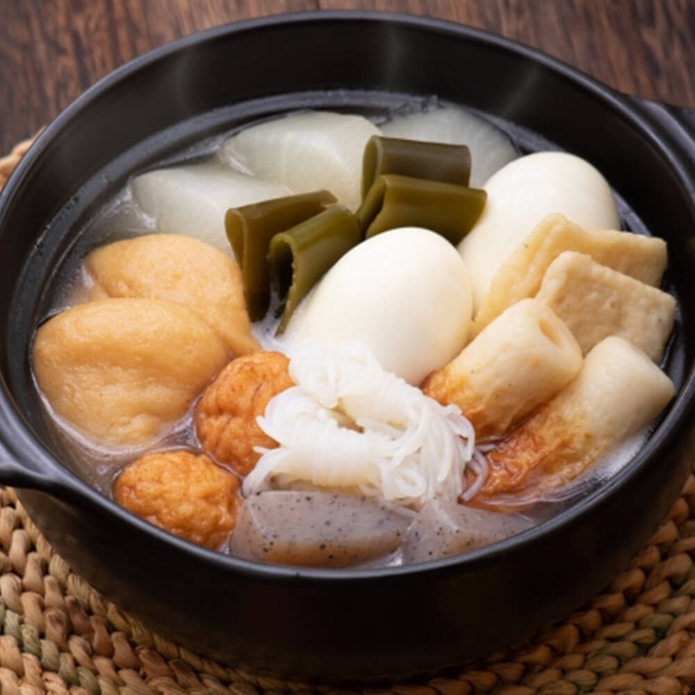 水煮大根、ゆで玉子、こんにゃく、厚揚げ、昆布、おでん汁の素(しょうゆ、食塩、ぶどう糖果糖液糖、かつおエキス、煮干、野菜エキス、たん白加水分解物、かつお節、さば節、昆布エキス)、水あめ、かつおエキス/ソルビトール、加工でんぷん、調味料(アミノ酸等)、水酸化Ca、酸化防止剤(V.E)、V.C、(一部に卵・小麦・牛肉・さば・大豆を含む)